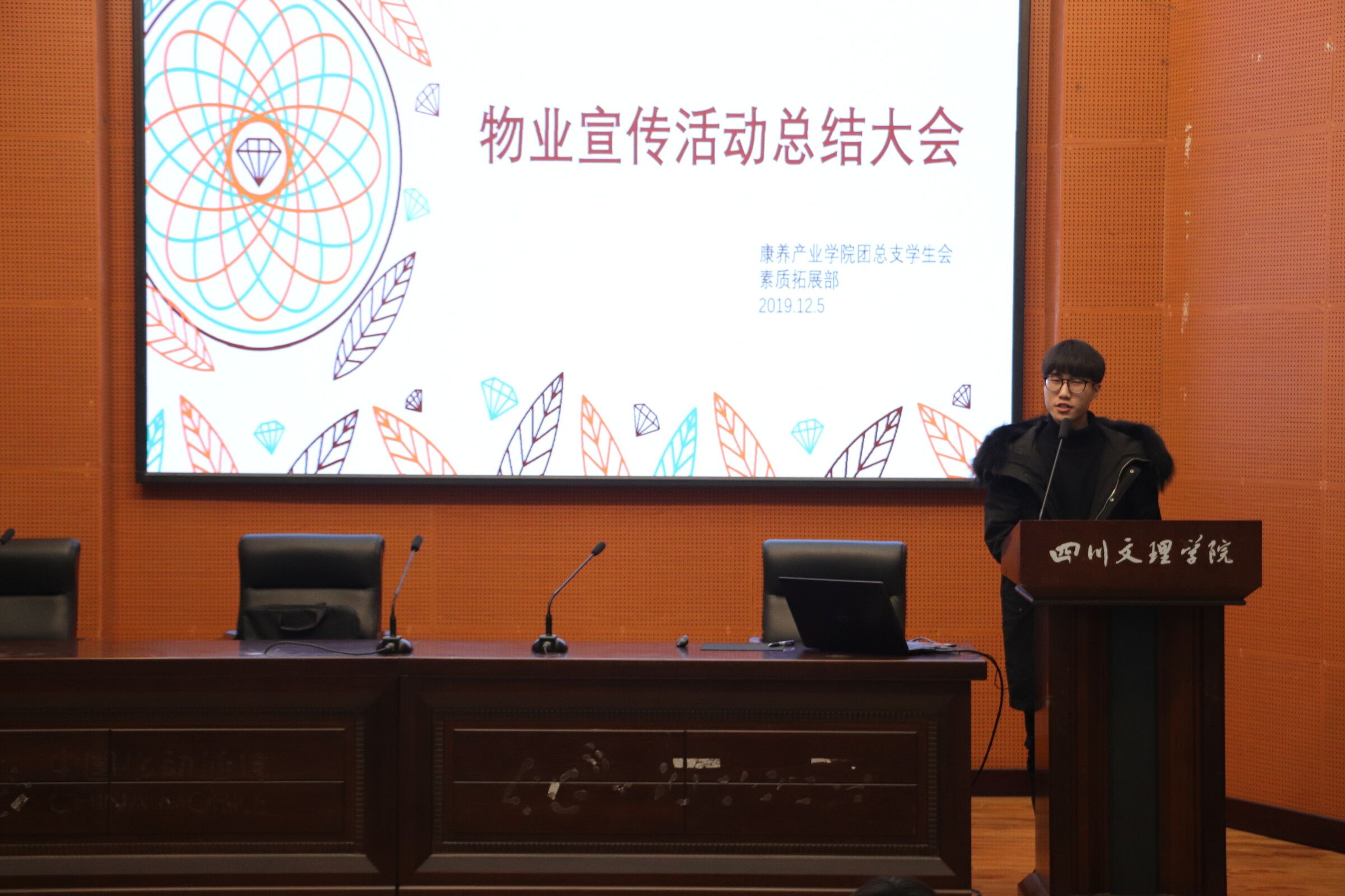 2019年12月5日晚7点整,bbin宝盈游戏官网2019级物业管理1班、2班的员工在学术报告厅B厅参加了本次物业管理宣传周总结大会。此次大会由bbin宝盈游戏官网素质拓展部举办,出席的嘉宾有主席团杨婷、郭宇、汪丽、于慧晴和本次活动负责人王志康,主持人王恩维。