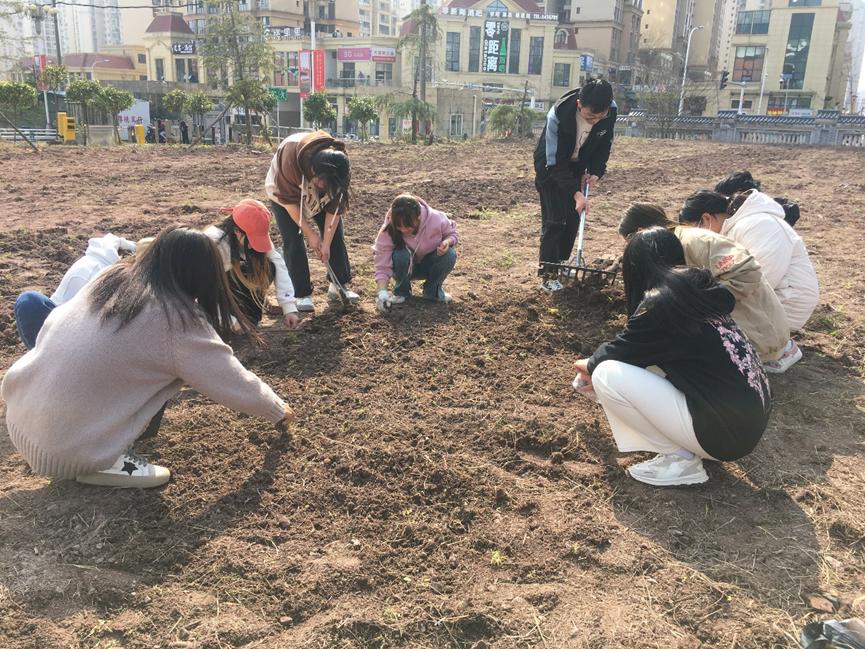同学们按照指示提前来到西大门出口一侧集合。指导教师谢佳佳、王馨彤向同学们讲述此次劳动教育课的意义、任务安排以及注意事项,特别强调在劳动过程中同学们要以安全为主,量力而行。陈丹曾是农学专业毕业,向同学们示范播种技术。活动中,同学们在老师的带领下,认真学习翻土和除草技巧,大家分工合作,有条不紊,你追我赶,乐在其中。