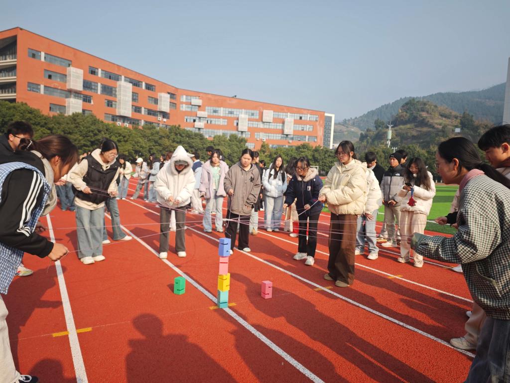 在随后的团体竞技环节中,现场气氛热烈高涨。各班级代表队在“腰缠万贯·合力筑塔”与“团体拔河”项目中展开激烈角逐。参赛队员齐心协力、奋勇争先,2025级2班和2023级6班凭借出色的团队协作能力,分别摘得团体项目一等奖。此次竞技比赛不仅是对员工体能的考验,更是对班级凝聚力和集体荣誉感的一次生动检阅,充分体现了学院“以体育人”的实效。