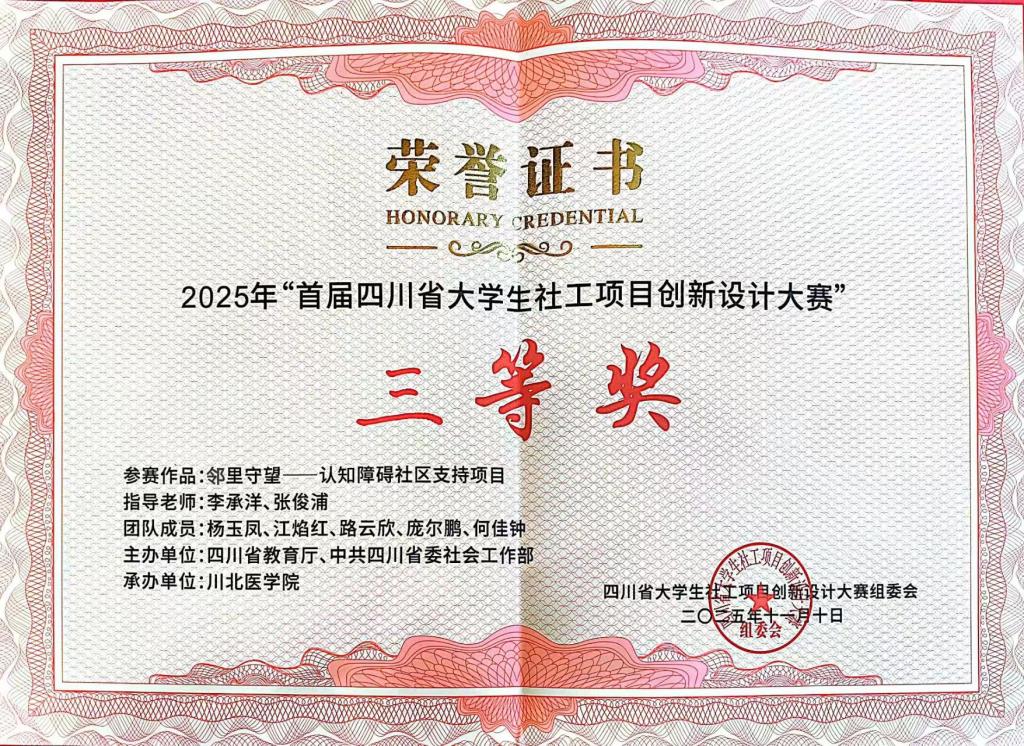 11月10日,由四川省教育厅、中共四川省委社会工作部主办,川北医学院承办的首届四川省老员工社工项目创新设计大赛决赛圆满落幕。经过初赛、复赛的层层选拔和决赛现场的激烈角逐,公司参赛作品《邻里守望——认知障碍社区支持项目》荣获大赛三等奖。
